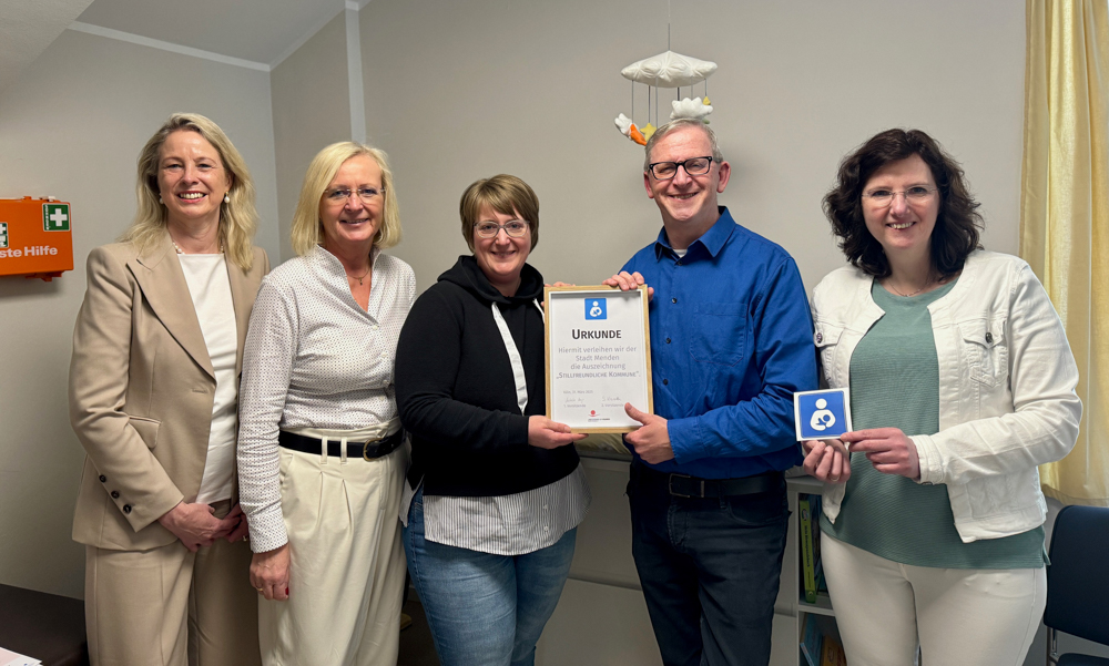 (PSM). Die Stadt Menden darf sich ab sofort offiziell „Stillfreundliche Kommune“ nennen: Der Landesverband der Hebammen Nordrhein-Westfalen e. V. hat der Stadt das entsprechende Zertifikat verliehen. Mit vielfältigen Unterstützungsangeboten möchte die Stadt Eltern das Stillen und Füttern im öffentlichen Raum erleichtern. Darüber hinaus steht Stillenden jetzt ein Stillraum im Neuen Rathaus der Stadt Menden zur Verfügung. In dem eigens eingerichteten Raum, zentral gegenüber der Information im Foyer, können sich Mütter zum Füttern ihrer Kinder zurückziehen. Familien finden dort zudem eine Wickelmöglichkeit sowie eine kleine Spielecke, damit auch Geschwisterkinder von diesem Rückzugsort profitieren können. Darüber hinaus bietet das Familienbüro am Kirchplatz 2 nicht nur eine zentrale Anlaufstelle für (werdenden) Eltern, wenn es um Informationen geht, son- dern auch einen geschützten Raum zum Stillen, Füttern oder Wickeln. Zudem findet dort jeden ersten Donnerstag im Monat das Still-Café statt.