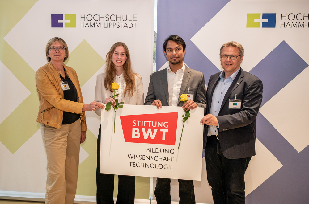 Bei der Stipendienfeier am Standort Lippstadt gratulierten Kreisdirektor Volker Topp als Stiftungsvorstand (r.) und Christina Kopmeier aus der Geschäftsstelle der Stiftung BWT (l.) den Stipendiaten Celeste Edel (2. v. l.) und Joachim Kennedy Gomez (3. v. l.), der ein Folgestipendium erhielt. Foto: HSHL/Oliver Felchner