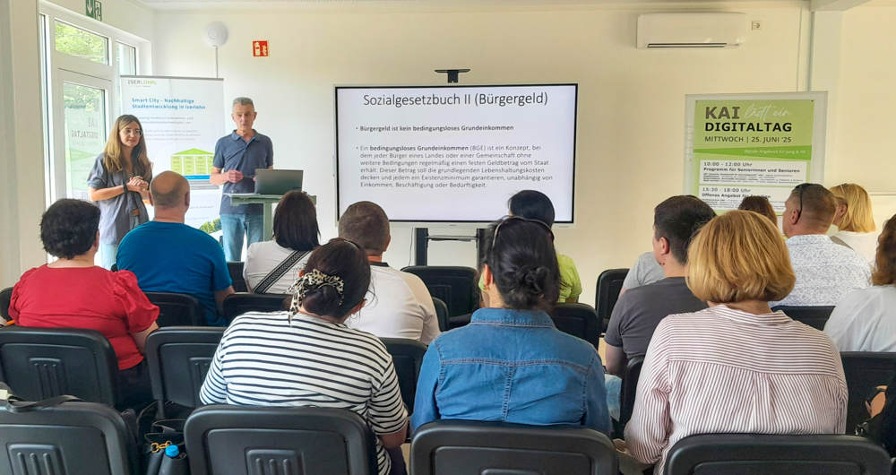 Um hier aufzuklären, fand jetzt Juni eine Informationsveranstaltung zum Thema „Bürgergeld: meine Rechte und Pflichten“ statt – organisiert von der Beratungsstelle Arbeit MK in Kooperation mit der Migrationsberatung für Erwachsene (MBE), beides Einrichtungen der Diakonie Mark-Ruhr. Ort der Veranstaltung waren die neuen Räumlichkeiten der Stadt Iserlohn im Bürgerinformationsbüro KAI (Kommunikation I Austausch I Innovation) in der Rahmenstraße.