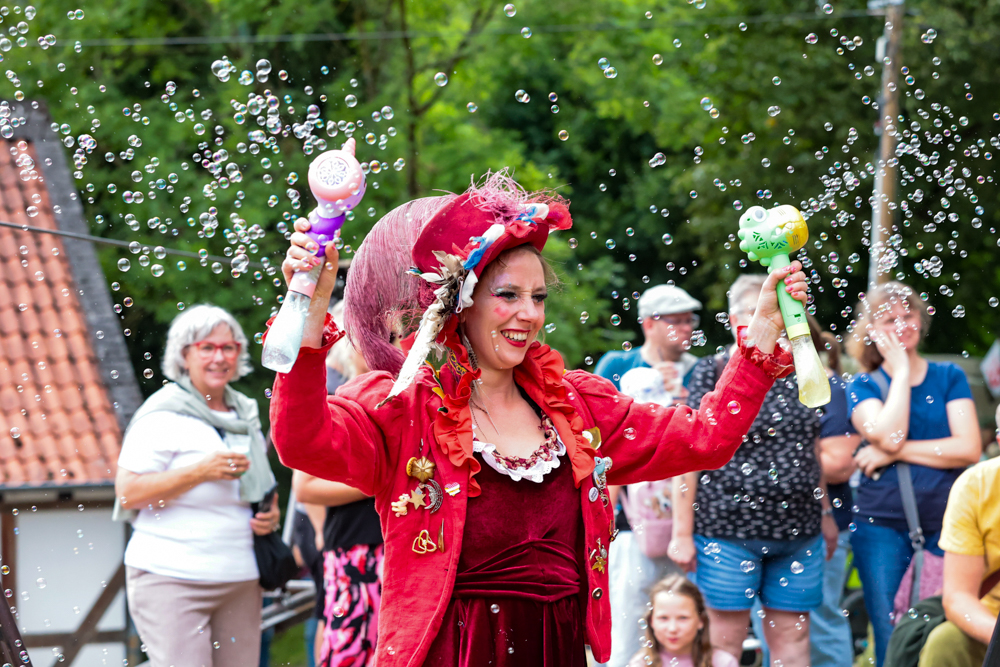 Etwa 3.500 Besucherinnen und Besucher erlebten an der Luisenhütte in Balve-Wocklum ein buntes Programm für die ganze Familie. Die Künstlerinnen und Künstler bespielten ab 17 Uhr das gesamte Gelände der historischen Hochofenanlage und setzen das Motto „Unterirdisch“ genial in Szene. Vom Feuerdrachen Fangdorn konnten insbesondere die Kinder nicht genug bekommen. Zu den Publikumslieblingen avancierten auch die wilden Zwerge der „Aristokraten“, die mit gewagter Luft- und Bodenkunststücken die Besucherinnen und Besucher zum Staunen brachten. Mit Sinn für Slapstick und Wortwitz bezogen sie dabei geschickt das Publikum mit ein. Die elfenhafte, musikalische Untermalung lieferte die Band Faeland.