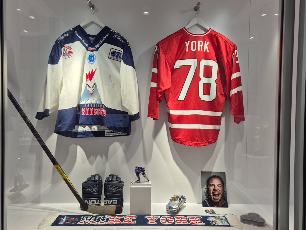 Die Trikots von Roosters-Legende Mike York bekommen jetzt ihren Platz in einer eigenen Doppelvitrine im Eishockey-Museum „puck“. Foto: Eishockey-Museum.