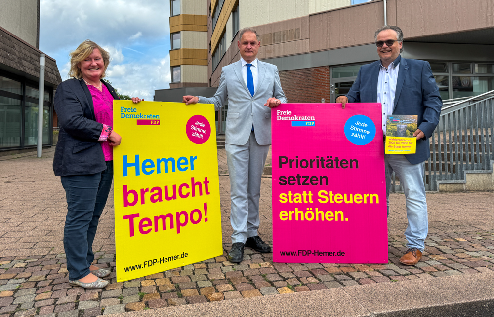 „Hemer braucht Tempo!“ ist erneut der Slogan der Kampagne, denn er gelte für Hemer immer noch, so Spitzenkandidat Arne Hermann Stopsack. „Wir standen in der Vergangenheit und stehen auch in Zukunft als Partei maßgeblich dafür, dass bei Projekten und Ausgaben Prioritäten gesetzt werden. Aber bei einigen Themen muss man dann auch mal aufs Gaspedal drücken, anstatt auf die Bremse“, so Stopsack weiter. Deshalb rücken die Freien Demokraten im Wahlprogramm die Themen Digitalisierung, Bildung, Verkehr und solide Finanzen in den Fokus.