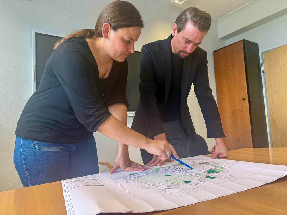 Sandra Kriewaldt von der (ZGW) und Kulturhaus-Leiter Dirk Lattemann besprechen das weitere Vorgehen nach dem Asbest-Fund. Foto: Sven Helmig/Stadt Lüdenscheid