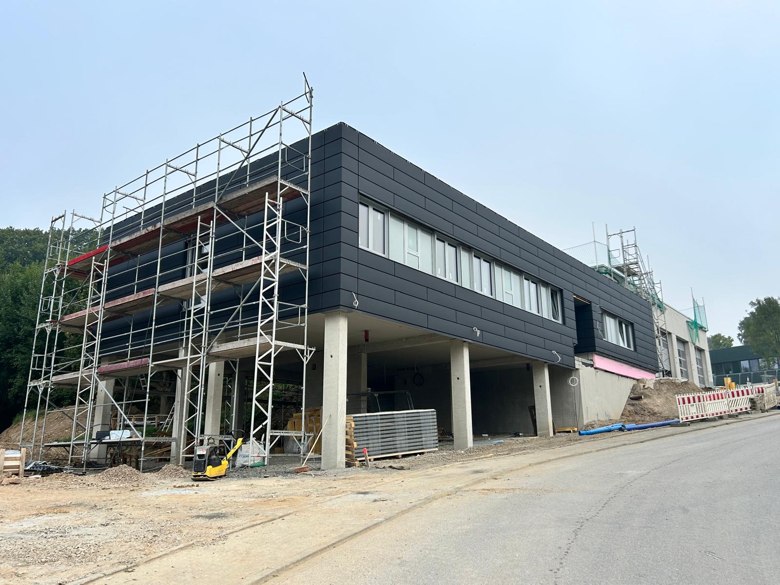Aktuell dauern die Fassadenarbeit am Sozialtrakt an. Die Gebäudehülle ist dicht. Nachdem die Dächer abgedichtet sind, folgt auf dem Hallendach die Absturzsicherung und die Einrichtung der Photovoltaikanlage. Innen sind die Trockenbauarbeiten vorerst abgeschlossen. In den Lagerräumen der Halle und im Sozialtrakt haben die Malerarbeiten begonnen. Die Türzargen sind eingebaut. Bald starten die Fliesenarbeiten in den Ruheraumbädern. Parallel laufen die Installationen für Strom, IT, Heizung, Lüftung und Sanitär. Rettungsspezifische Vorgaben an die Technik werden Schritt für Schritt umgesetzt. In der Halle wurden bereits die Tore verbaut und die Fußbodenheizung im Estrich verlegt. Die Abgasabsaugung wird vorbereitet.