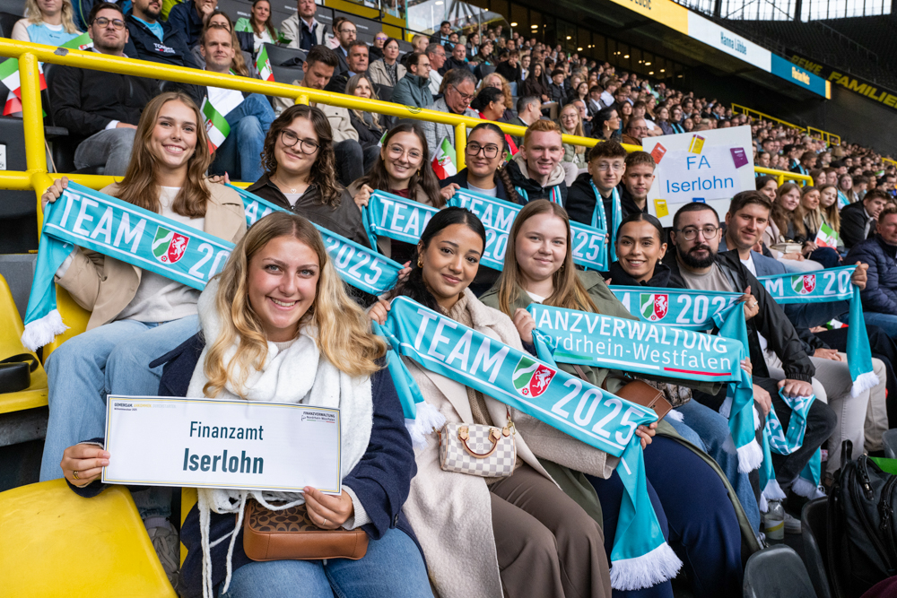 (EB). Die Haupttribüne des BVB-Stadions ein Meer aus Fahnen und Fanschals – und die Nachwuchskräfte des Finanzamts Iserlohn sind mittendrin! Denn auf den Schals steht statt dem Namen eines Fußballclubs „Finanzverwaltung für Nordrhein-Westfalen“. Mit einer großen Willkommensfeier wurden insgesamt 1.600 Talente in den Reihen der Finanzverwaltung begrüßt – durch Ministerpräsident Hendrik Wüst, Minister der Finanzen Dr. Marcus Optendrenk und die BVB-Geschäftsführer Hans-Joachim Watzke sowie Lars Ricken. Ein besonderer Karrierestart für die sechs neuen Auszubildenden und acht dual Studierenden, die im September beim Finanzamt Iserlohn ihren Dienst aufgenommen haben, um künftig für die Menschen in den Gemeinden Iserlohn, Hemer, Menden und Balve zu arbeiten.