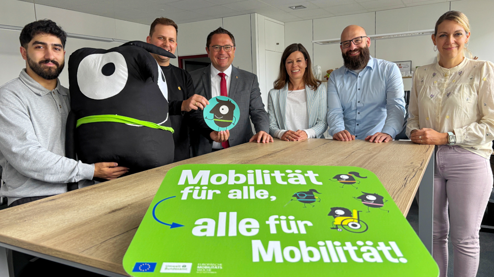 Freuen sich auf die Europäische Mobilitätswoche (von links): Ali Yuvanc (Marketing MVG) mit Maskottchen Edgar, MK-Radverkehrsbeauftragter Raphael Jolly, Landrat Marco Voge, MVG-Geschäftsführerin Frauke Effert, Sebastian Bittrich (MVG-Marketing und Kommunikation) sowie Vera Mölders, Sachbearbeiterin Mobilität und Radverkehr MK. Foto: Alexander Bange / Märkischer Kreis