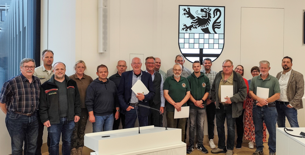 Im Rahmen einer Jahresbesprechung im Lüdenscheider Kreishaus wurden verdiente ehrenamtliche Mitglieder der Jägerprüfungsausschüsse Iserlohn und Lüdenscheid ausgezeichnet. Foto: Märkischer Kreis