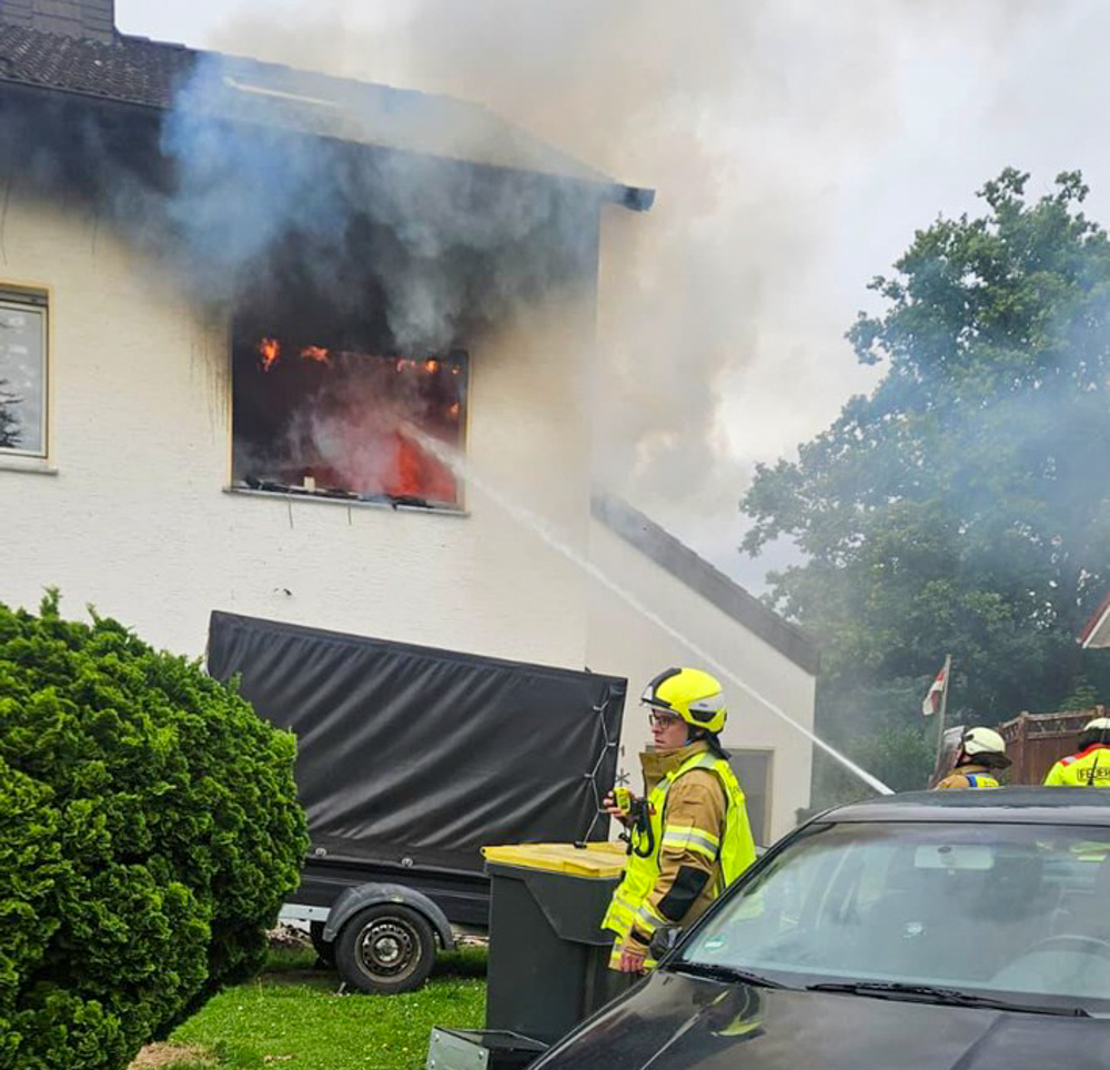 Als die Feuerwehr vor Ort eintraf, schlugen bereits Flammen aus einem Fenster im ersten Obergeschoss des Wohnhauses und drohten auf den darüberliegenden Dachbereich überzugreifen. Durch die schnelle Vornahme eines Strahlrohres von außen konnte gezielt Löschwasser in den Brandraum eingebracht werden, dies schlug die offenen Flammen nieder und verhinderte eine Ausbreitung auf die Traufe.