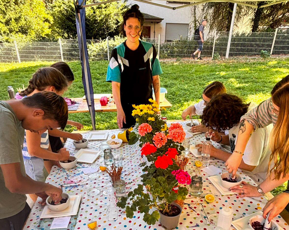 Im Rahmen der „Ferien in Hemer“ brachte sie im August auch eine Gruppe von Kindern, Jugendlichen und jungen Erwachsenen im Jugendzentrum Hemer zum Staunen. Bei gutem Wetter konnte der Workshop draußen stattfinden. Es wurde fleißig gemörsert, gefiltert, experimentiert und gemalt – die Künstlerin, die ihre kleine Galerie „Kunstklitsche DiLa“ in Hemer betreibt, stand stets mit Rat und Tat zur Seite. „Wobei es bei diesen Workshops auch häufig von selbst zu einer ganz besonderen Dynamik, einem schönen Austausch zwischen den Teilnehmenden kommt.“, sagt die Künstlerin. Die Sevengardens Pflanzenfarben Workshops fördern das soziale Miteinander ungemein.