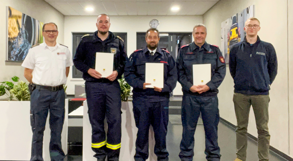 Als zentrale Ansprechpartner wirken ab sofort drei Koordinatoren auf Kreisebene. Ihre Aufgaben umfassen die Organisation von Aus- und Fortbildungen, die Vernetzung mit überörtlichen Einheiten und Behörden sowie den regelmäßigen Austausch mit dem Märkischen Kreis. Kreisbrandmeister Michael Kling hat Sven Homann aus Nachrodt-Wiblingwerde, Dominic Kircheis aus Kierspe und Peter Sauerbrey aus Iserlohn offiziell zu den neuen Koordinatoren ernannt. Unterstützt wird die Arbeit auf Kreisebene zudem durch Fabian Scholz, Sachbearbeiter im Fachdienst Brand- und Bevölkerungsschutz.