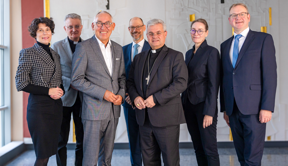 Marlene Hoischen, Erzbistum Paderborn, Monsignore Joachim Göbel, Leiter des Bereichs Schule und Hochschule beim Erzbistum Paderborn, Regierungspräsident Heinrich Böckelühr, Dr. Andreas Hohlfeld, Abteilungsleiter Asyl bei der Bezirksregierung Arnsberg, Erzbischof Udo Markus Bentz, Uta Diers, Leiterin der Schulabteilung bei der Bezirksregierung Arnsberg, Marcus Baumann-Gretza, Justiziar beim Erzbistum Paderborn. Foto: Jason Rittmeyer, Bezirksregierung Arnsberg