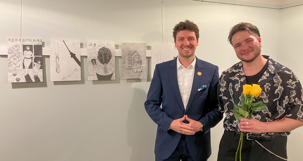 Museumsleiter Marius Stiehler mit dem Gewinner des MKK-Stipendiums Eden Nael Liedtke Bildnachweis: Museen Menden/Schäckermann