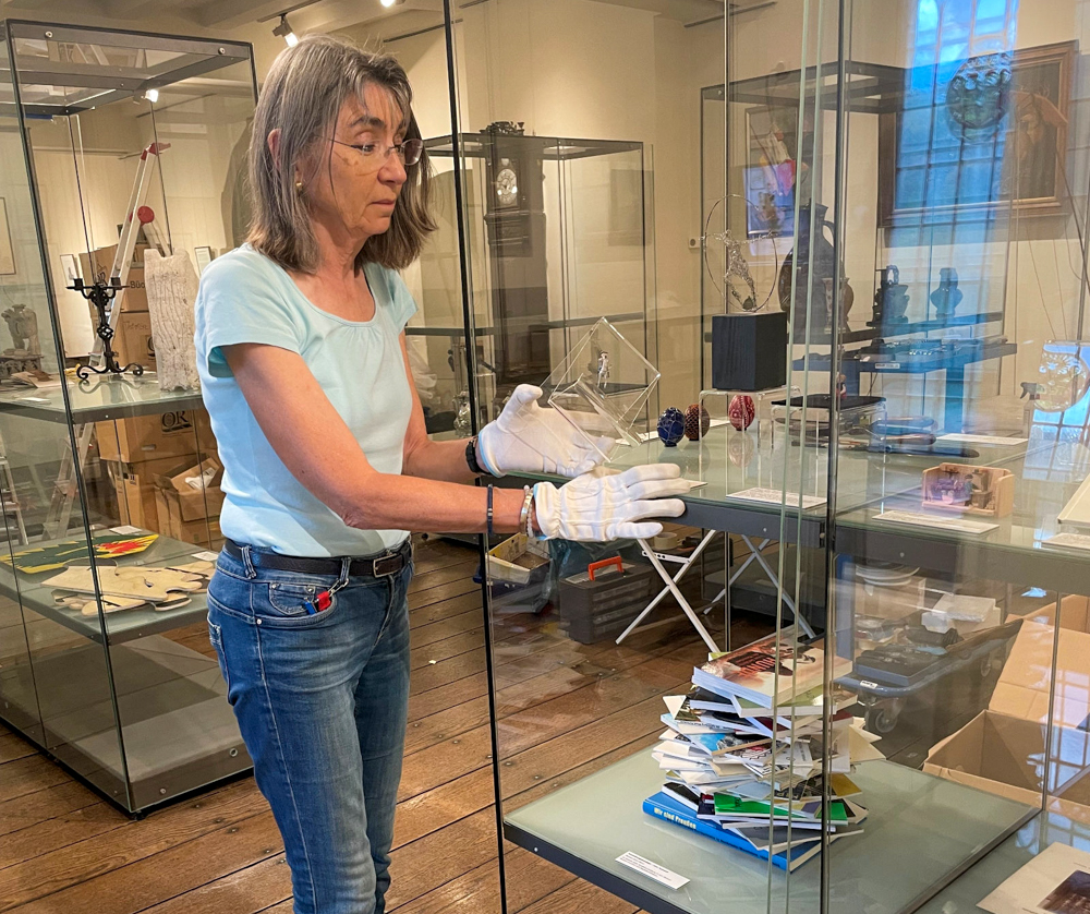 Ausstellungskuratorin Dr. Agnes Zelck legt beim Aufbau der Sonderausstellung „Rückblick – 150 Jahre Museumsgeschichte in Altena“ selbst Hand an. Foto: Bernadette Lange/Märkischer Kreis