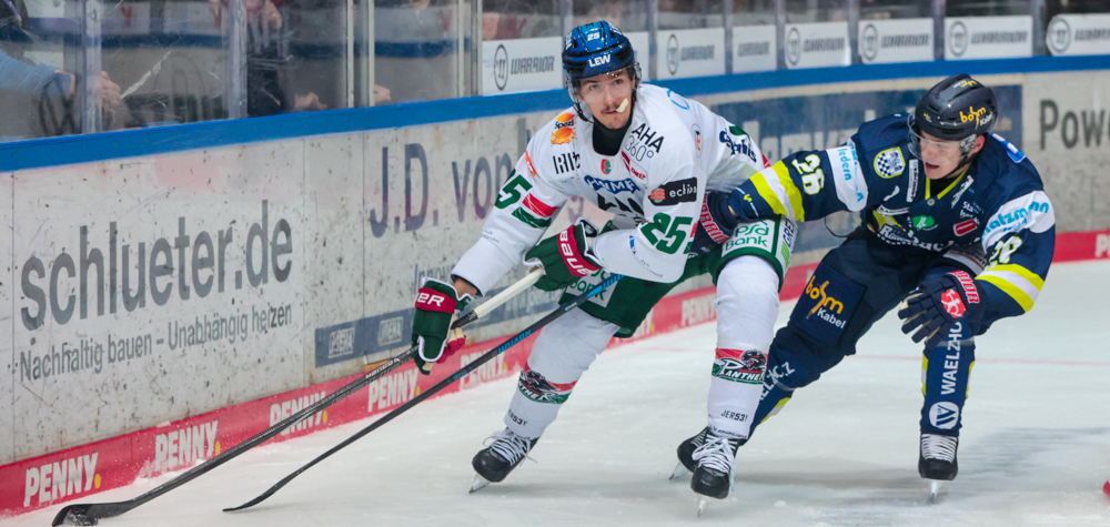 Christian Hanke (Augsburg) im Zweikampf mit Iserlohns Lua Niehues. Foto: Sebastian Sendlak