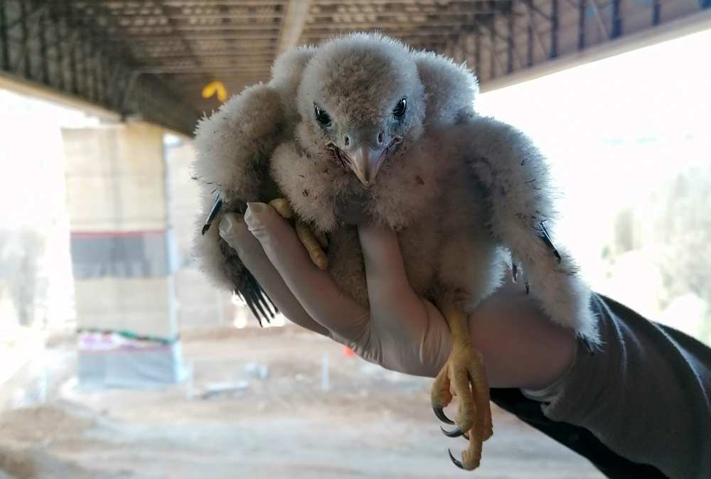 Rückblick: Wanderfalken-Weibchen Lulani als Küken: Vor der Sprengung der Talbrücke Rahmede wurde sie zu einem anderen Brutplatz weit entfernt vom Märkischen Kreis transportiert. Foto: Caroline Bendrien / Märkischer Kreis