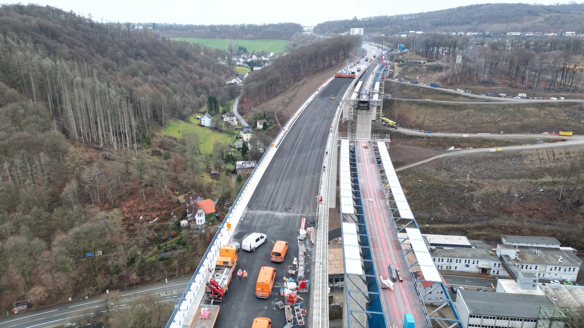 Die alte Talbrücke Rahmede musste im Dezember 2021 aufgrund schwerer Schäden gesperrt und im Mai 2023 gesprengt werden. Der Neubau wurde unter Hochdruck vorangetrieben, um die immense Belastung durch den Umleitungsverkehr für Lüdenscheid und die umliegenden Kommunen so schnell wie möglich zu beenden.