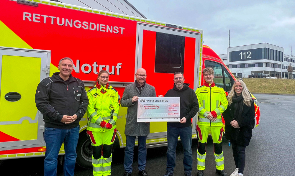 (pmk). Die Notfallsanitäter-Azubis des Märkischen Kreises spenden einmal mehr für einen guten Zweck. Sie überreichten eine Spende in Höhe von 150 Euro an den eingetragenen Verein Soko Respekt. Mit ihrer Aktion setzen die Auszubildenden ein deutliches Zeichen für gegenseitige Wertschätzung und respektvolles Miteinander. Sie übergaben die Spende persönlich an Jens Hoffmann, den Vorsitzenden von Soko Respekt. Zwei Notfallsanitäter-Azubis überreichten gemeinsam mit einer Verwaltungs-Auszubildenden sowie Fachdienstleiter Stefan Egger den symbolischen Spendenscheck in Höhe von 150 Euro.