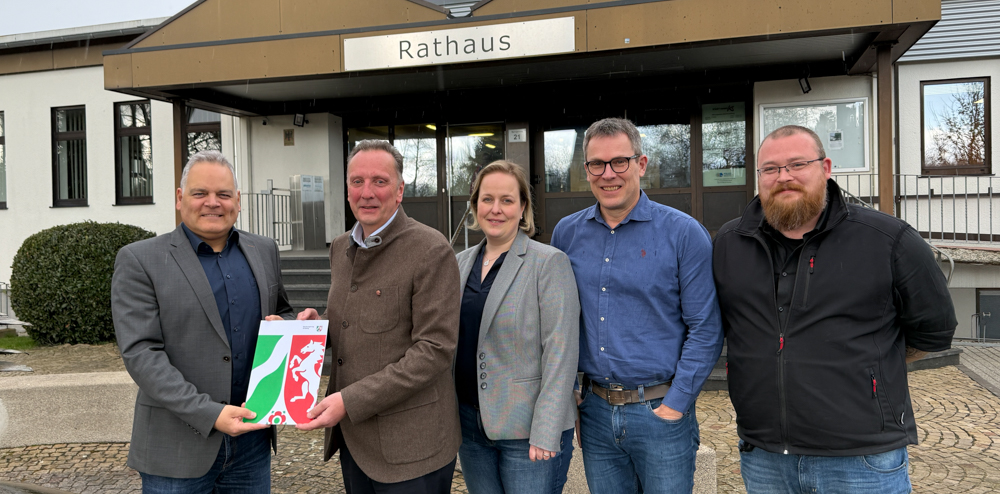 Freuen sich über den Förderbescheid: (von links) Olaf Stelse, Bürgermeister Kierspe, Thomas Sommer, Bezirksregierung Arnsberg, Kerstein Steinhaus-Derksen, Lars Feltens, Simon Trambacz, Stadt Kierspe. Foto: Stadt Kierspe