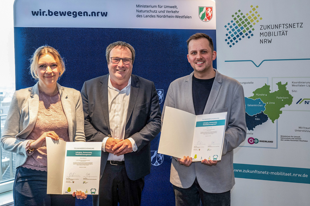 NRW-Verkehrsminister Oliver Krischer (mitte) überreichte Vera Mölders und Raphael Jolly vom Märkischen Kreis die Urkunden zur erfolgreichen Qualifizierung zur Mobilitätsmanagerin bzw. Mobilitätsmanager. Foto: MUNV NRW/Caroline Seidel