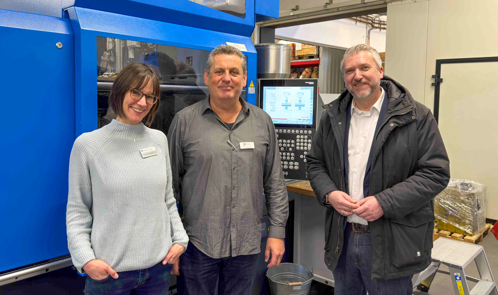 Sebastian Wagemeyer, Bürgermeister der Stadt Lüdenscheid (rechts), besuchte den Tag des Kunststoffs. Mit auf dem Foto Karina Schiweck, Kommunale Koordinierungsstelle "Kein Abschluss ohne Anschluss - Übergang Schule-Beruf im Märkischen Kreis und Torsten Urban, International Network Cluster Manager des Kunststoff-Instituts Lüdenscheid. Foto: Märkischer Kreis