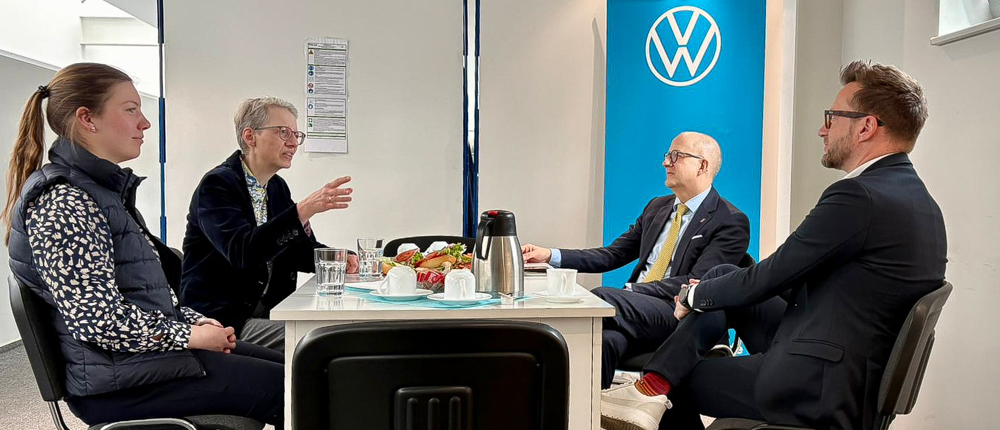 Kommunikation, miteinander im Gespräch zu bleiben, ist die Grundlage allen Handelns, egal ob in der freien Wirtschaft oder auch in einer Behörde. Darüber sind sich (v.l.n.r) Trainee Anna-Meta Pientka, Unternehmerin Petra Pientka, Landrat Ralf Schwarzkopf und VW Geschäftsleiter Oliver Boos einig. Foto: Nolte
