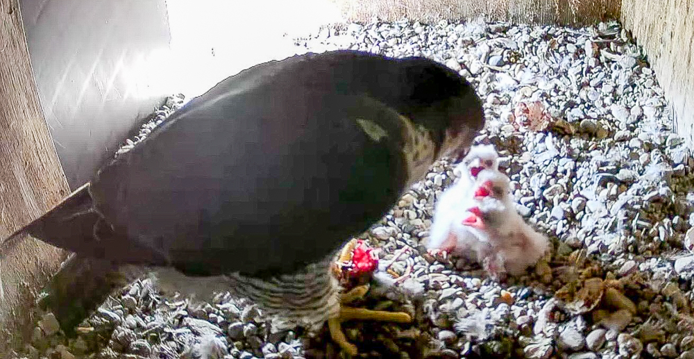 Mit Blick auf die nahe Zukunft erwartet die Untere Naturschutzbehörde an ihrem Nistkasten mit Kameras, dass die Wanderfalken-Küken ihre Augen öffnen und Gefieder bilden. In Wechselschicht von Wanderfalkenvater und -mutter werden sie gewärmt, geschützt und versorgt. Ab dem 20. Tag erfolgen die ersten Eigenbewegungen. Bereit für erste Flugversuche sind sie ab etwa dem 32. bis 42. Tag. Unter Schutz ihrer Eltern erreichen sie nach etwa weiteren zwei Wochen ausreichend Flugsicherheit und können Gefahren besser erkennen. Danach verlassen sie den Kasten und suchen eigene Reviere beziehungsweise Partner. Bis dahin ist für die Wanderfalken-Küken aber noch viel Zeit.