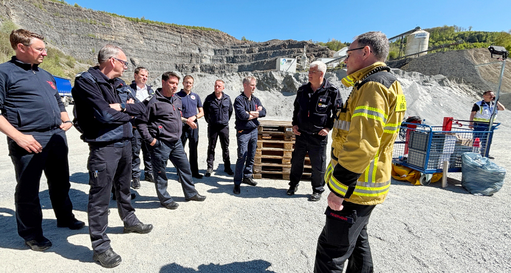 Kreisbrandmeister Michael Kling machte sich mit dem Stab der Einsatzleitung und der Kreisleitstelle ein Bild über die Arbeiten am Steinbruch. Foto: Alexander Bange / Märkischer Kreis